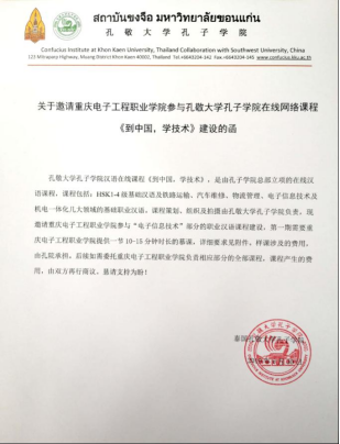 整个项目到2020年4月初完成第一阶段任务,所有微课基本均已录制完成并通过审核,等待上线提供给教学服务。相关工作得到泰国孔敬大学孔子学院的大力赞扬,他们给我校国际交流与合作发展处发来感谢信,对参与整个项目的付渊、刘睿强等老师颁发了在线课程建设证书,对项目的后继建设也进行了商议。通过与泰国孔敬大学合作开发课程资源,落地了我院的国际交流与合作,推动了特色专业课程资源国际化,凸显重电职教国际化品牌,增强服务“一带一路”能力,为双高建设添砖加瓦。
