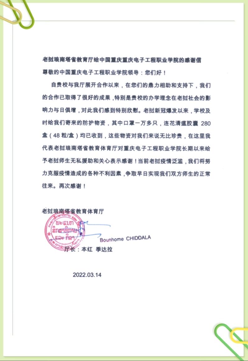 “感谢你们对老挝师生的无私援助!”近日,重庆电子工程职业学院收到了一封来自老挝琅南塔教育厅发来的感谢信,感谢学校在疫情期间对老挝师生无微不至的关怀。