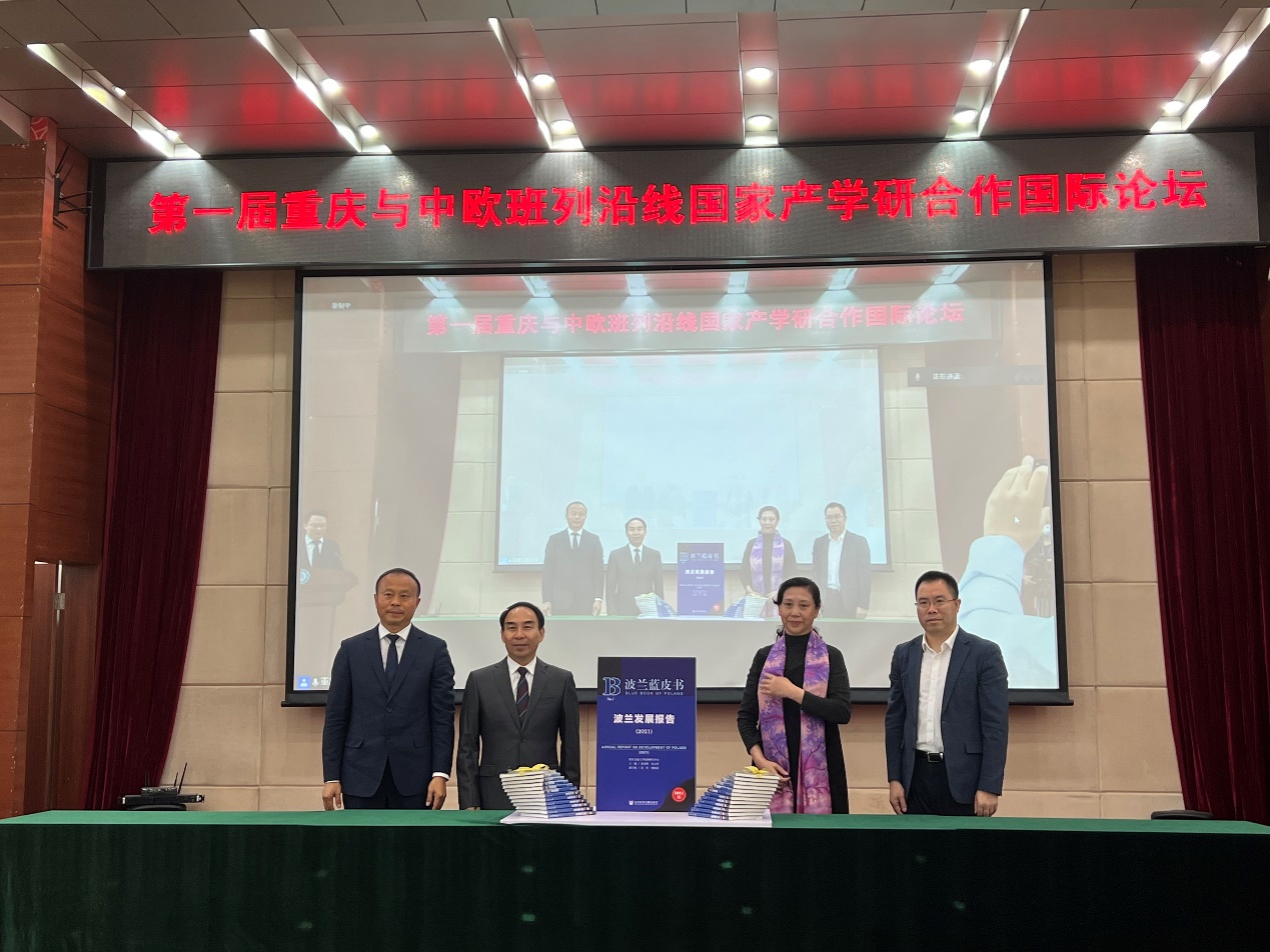 重庆交通大学国际教育学院院长余元玲宣布了欧洲研究中心第一批国际科研合作项目,波兰共和国驻成都总领事莫戈莳做发言致辞,重庆市教育委员会国际合作与交流处李斌处长宣布《波兰发展报告(2021)》蓝皮书揭幕。