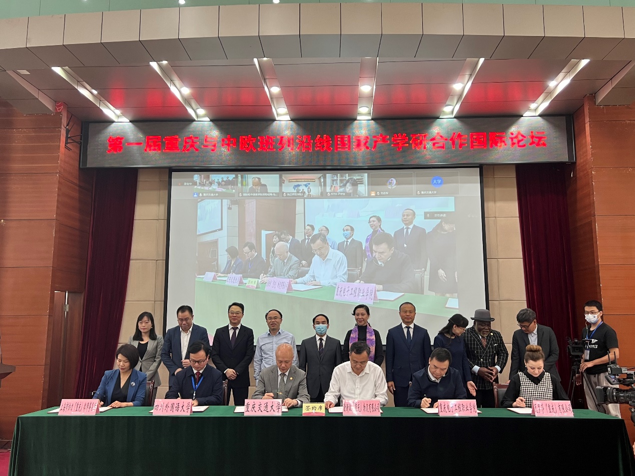 “重庆与中欧班列(渝新欧)沿线国家产学研合作联盟”由重庆交通大学、渝新欧(重庆)物流有限公司等10余家高校、企业、科研院所、政府部门共同倡议成立。在本次论坛上渝新欧(重庆)物流有限公司监事长周树林宣布联盟第一届理事会名单,聂强校长代表我校与联盟签约。