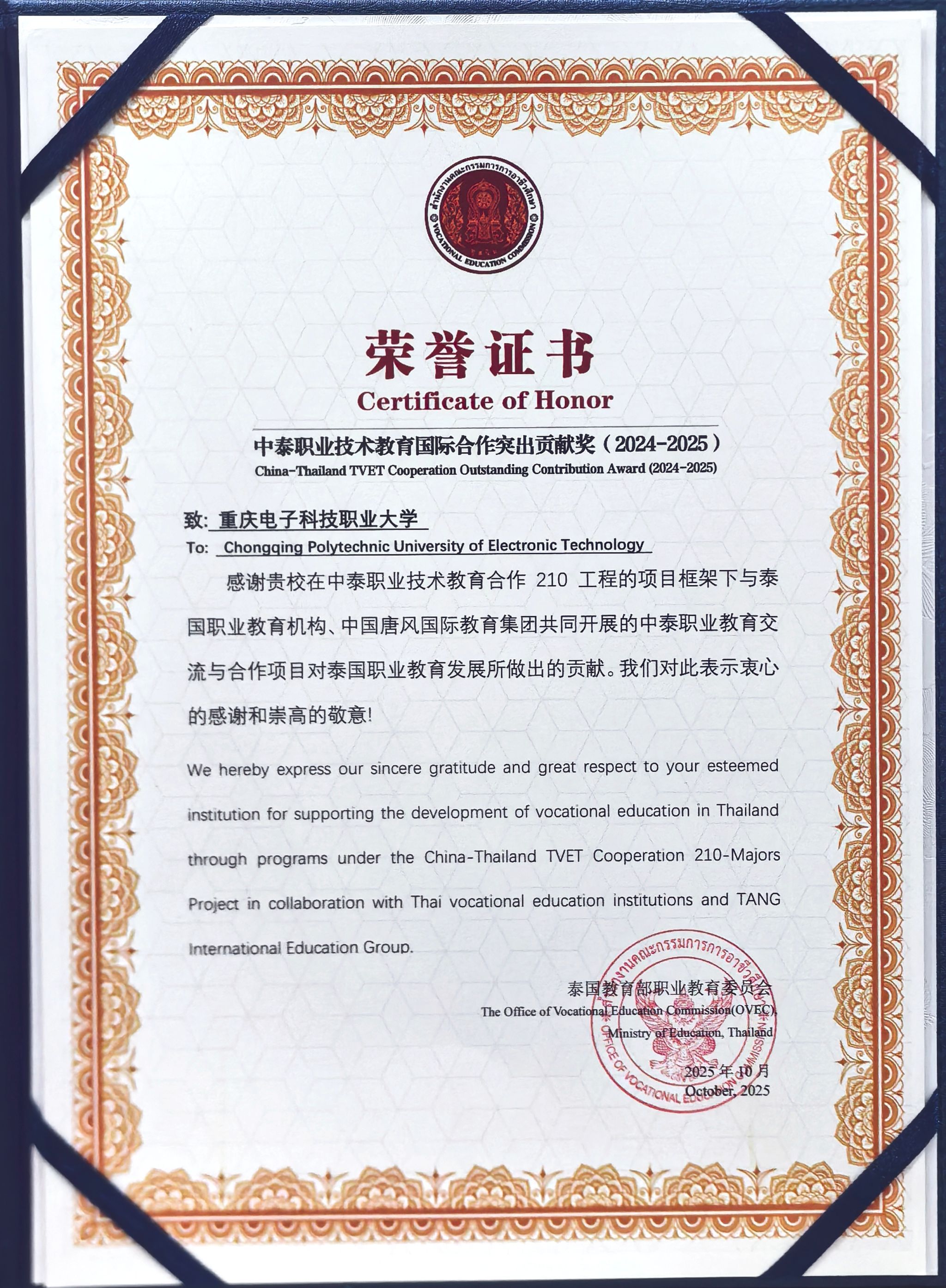 近日,我校再度荣获泰国教育部职业教育委员会颁发的“中泰职业技术教育国际合作突出贡献奖(2024-2025)”。该奖项既高度认可了我校在中泰职教合作“210 工程”框架下,与泰国职教机构、唐风国际教育集团的深度合作成果,亦是对我校助力泰国职业教育发展所做贡献的充分肯定。