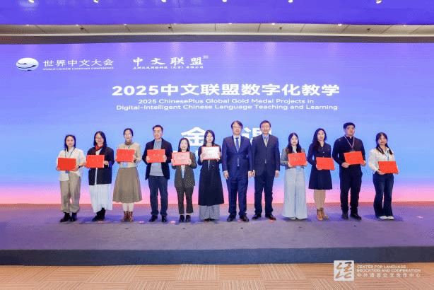 我校国际合作与交流处教师代表上台领取“2025中文联盟数字化教学金牌合作伙伴”奖项