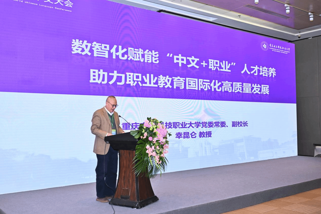 11月16日,我校党委常委、副校长幸昆仑率队参会并在“数智化时代‘中文+职业’人才培养研讨会”上以《数智化赋能“中文+职业”人才培养助力职业教育国际化高质量发展》为题作主旨演讲。幸校长系统阐述了学校近年来在推动职教国际合作中的创新实践:通过数智化专业建设精准对接国际产能需求,构建覆盖课程、实训、评价全链条的数智化生态体系,并依托系统化资源平台服务国际交流合作从而推动从“技能输出”向“标准输出”跃升。