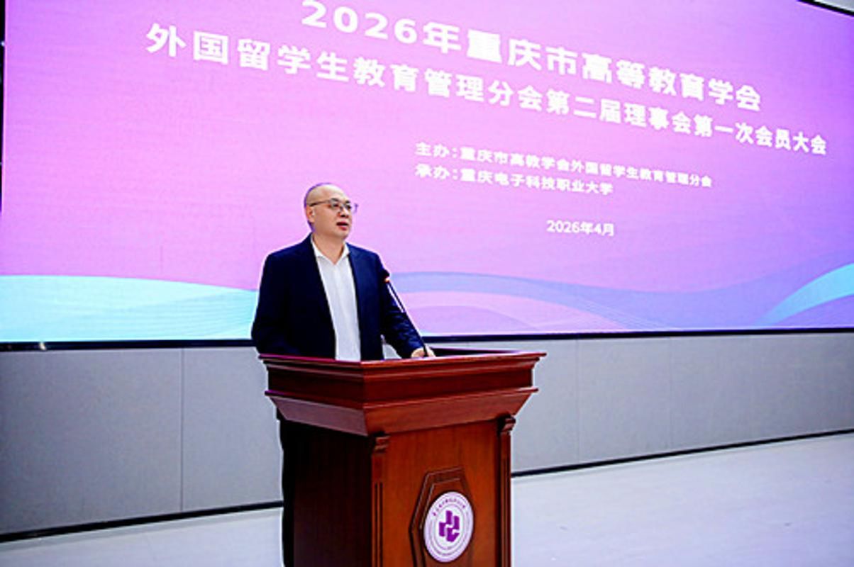 4月2日上午,重庆市高等教育学会外国留学生教育管理分会第二届理事会 2026年第一次会员大会在重庆电子科技职业大学博远厅隆重举行。市公安局出入境管理局副局长罗春兰,市教委国际合作与交流处副处长江燕,市高等教育学会秘书长余志祥出席,全市45所会员单位的180余名代表参会。会议由分会副理事长、四川外国语大学国际合作与交流处处长朱天祥主持。
