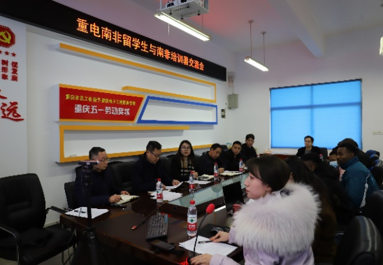 在沟通交流中,张进春院长对学校基本情况和留学生项目的具体执行情况进行了介绍;重庆狼道科技有限公司技术部部长刘方园和重庆闰多精密机械有限公司制造部部长冯燕分别对南非留学生的实习情况进行了说明;智能制造与汽车学院向南非留学生赠送了学院编写的英文教材;最后6名学生代表与南非培训署进行了交流,并就学生关切的问题进行了解答。